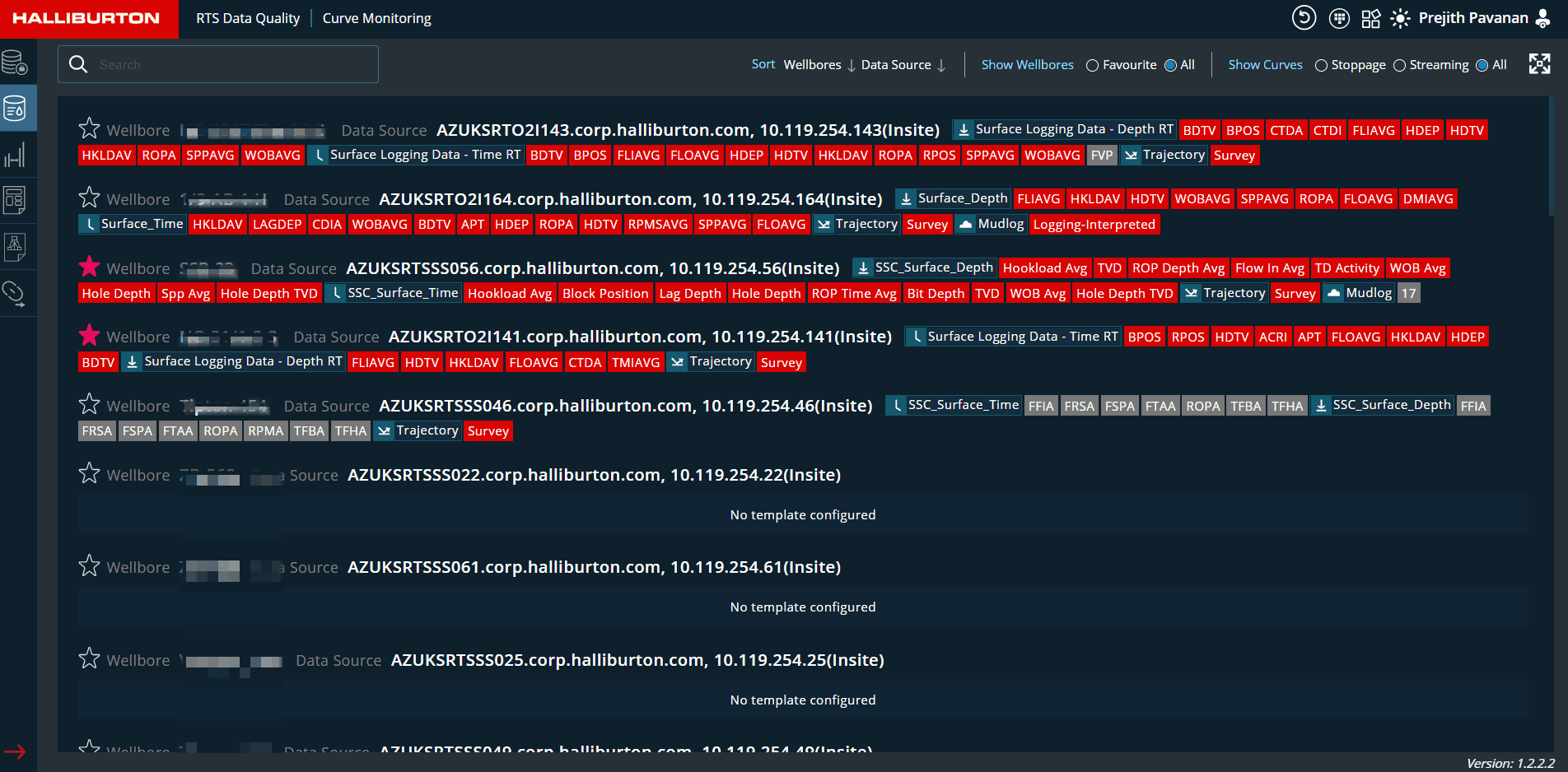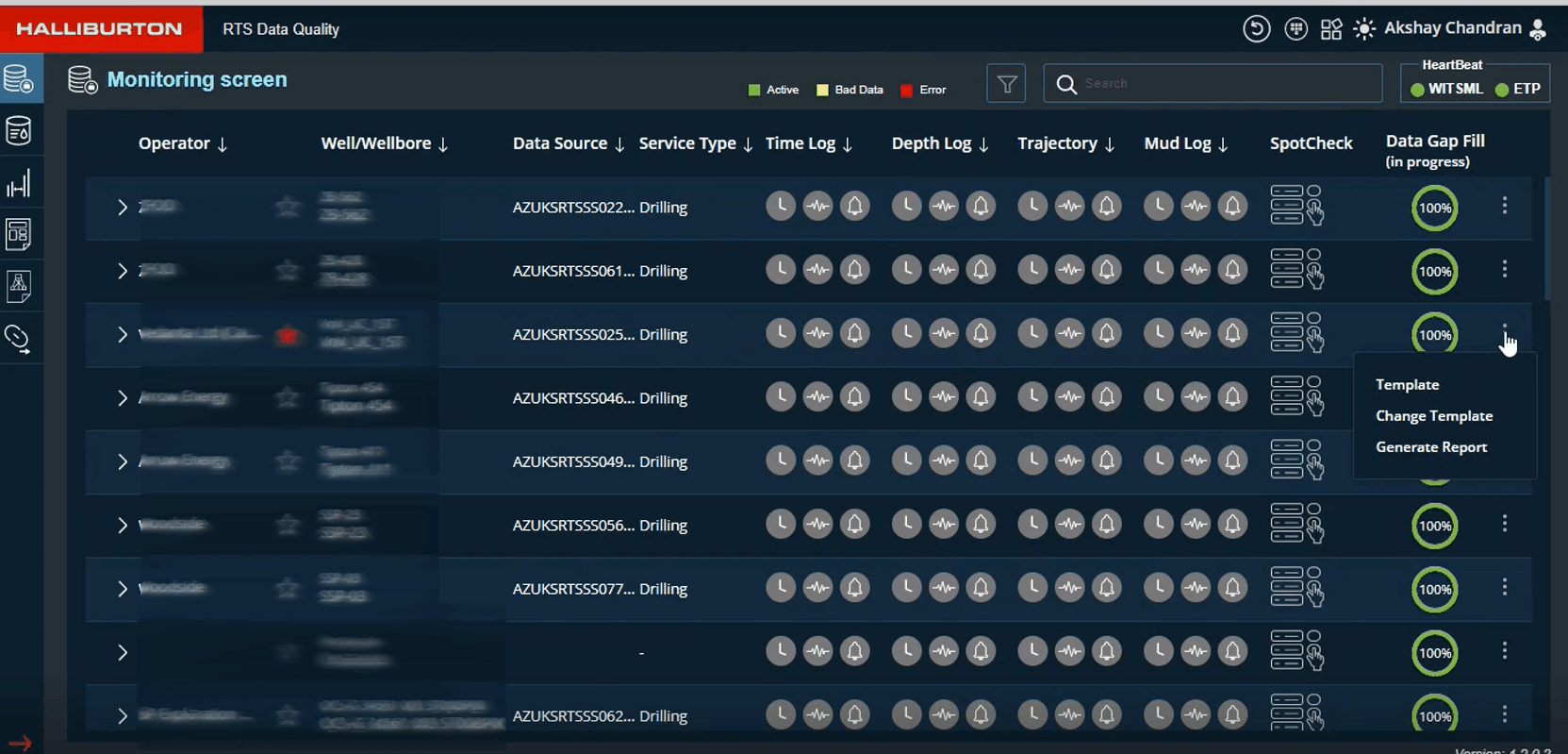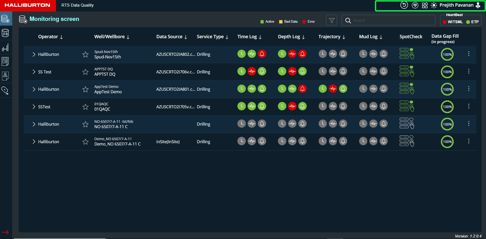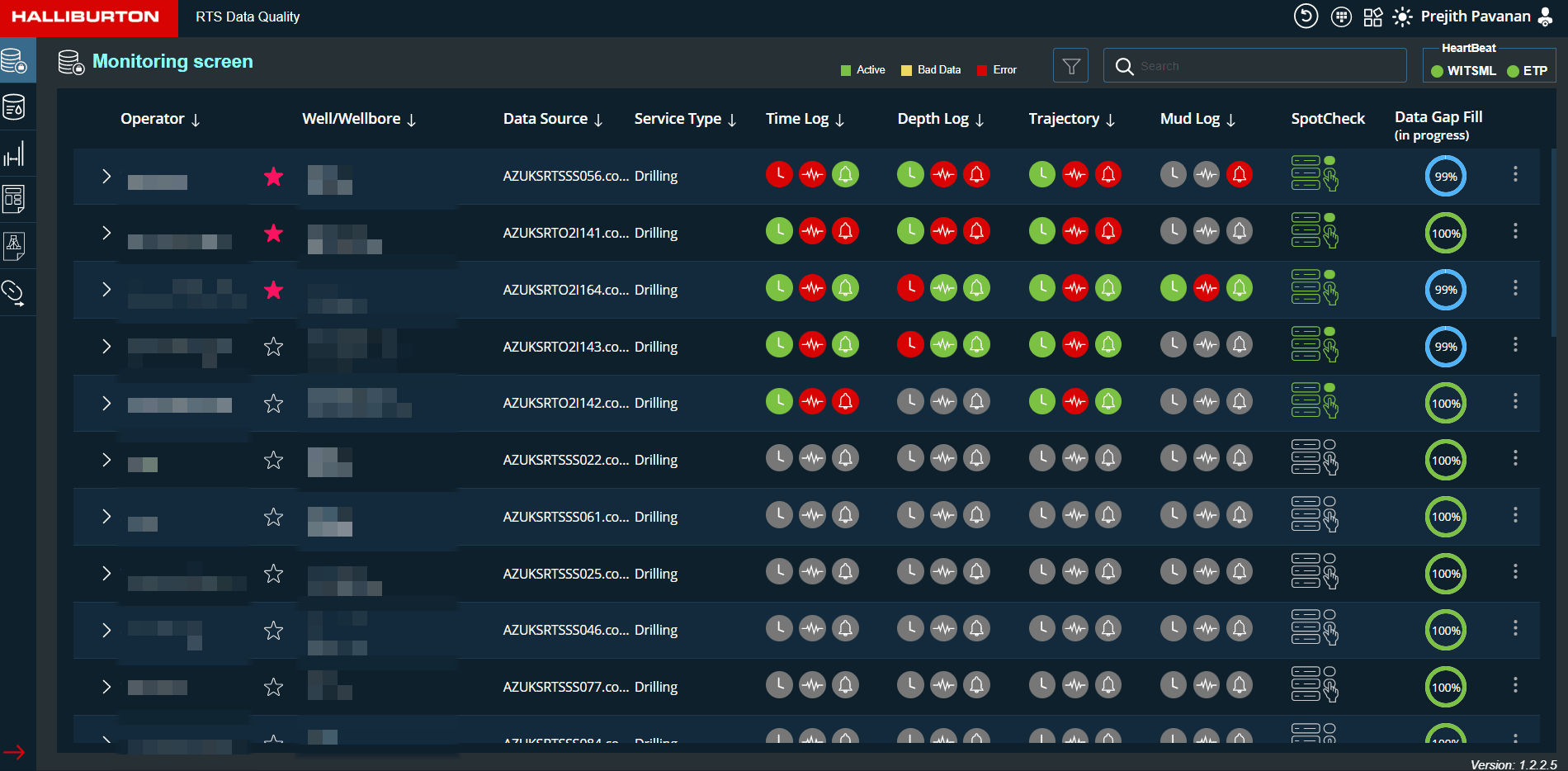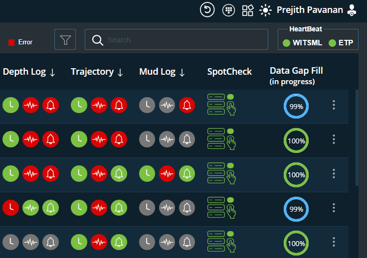 The wellbore monitoring screen displays the active wellbores (wellbores that are accessible to logged-in users) and allows users to monitor the real-time status/alerts/datagaps of all growing objects.