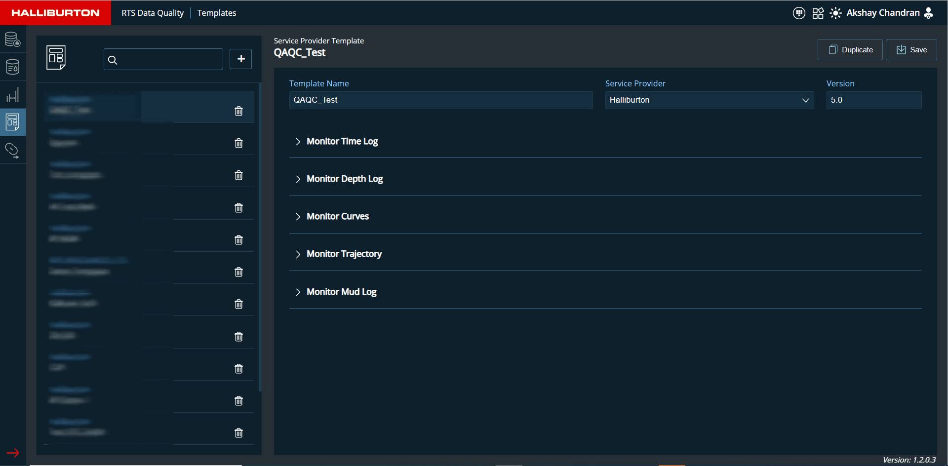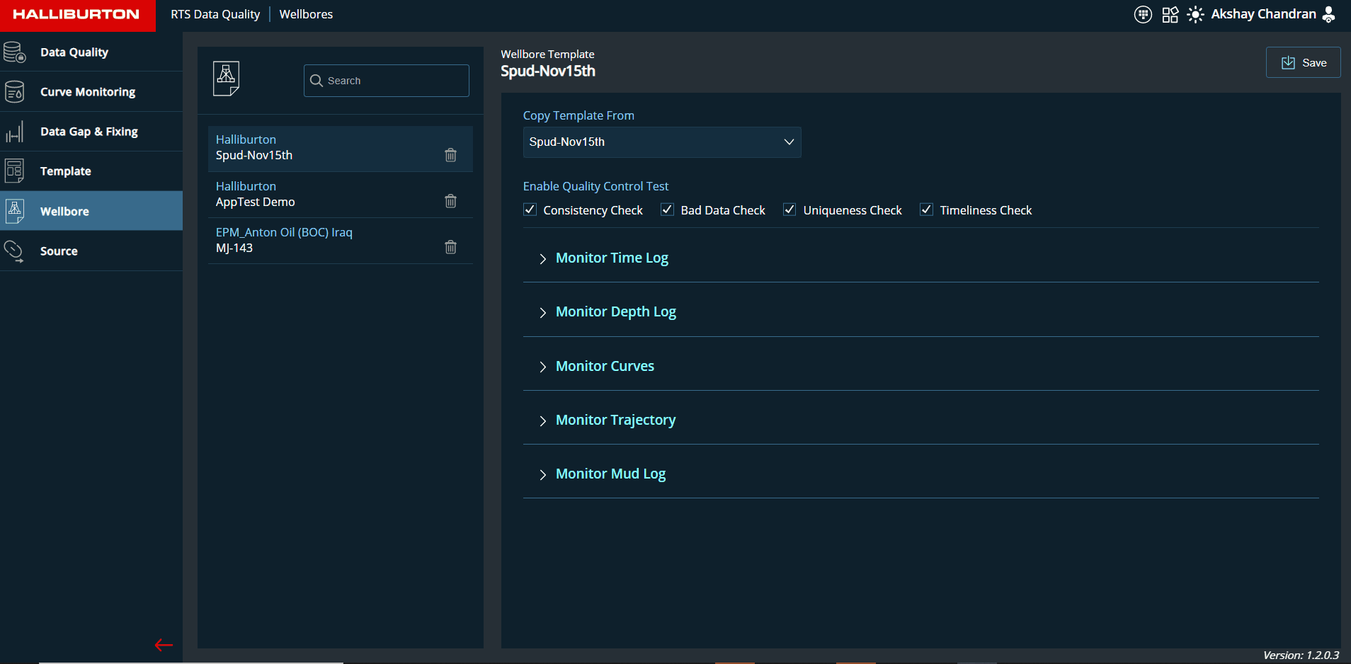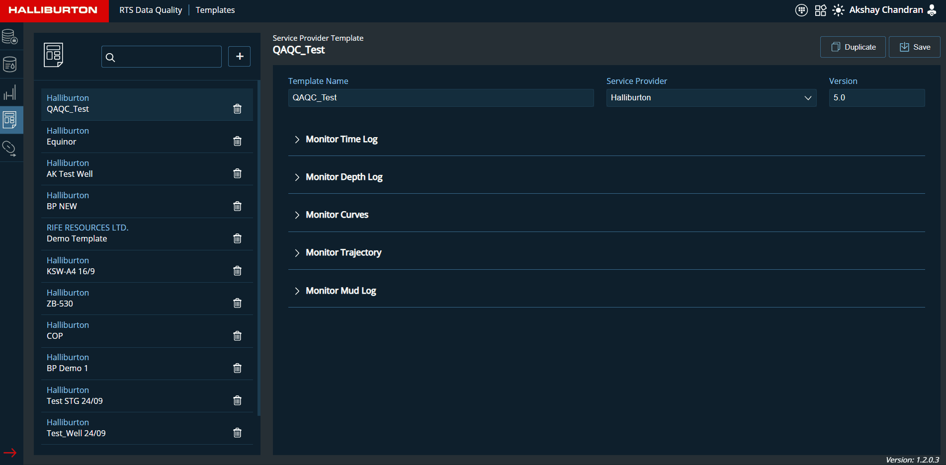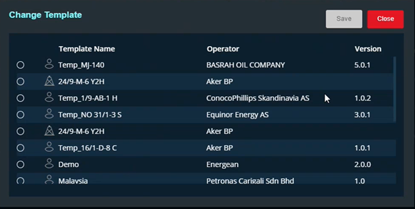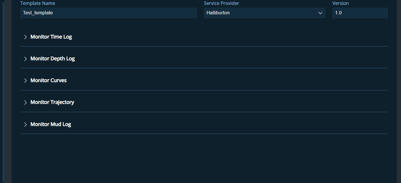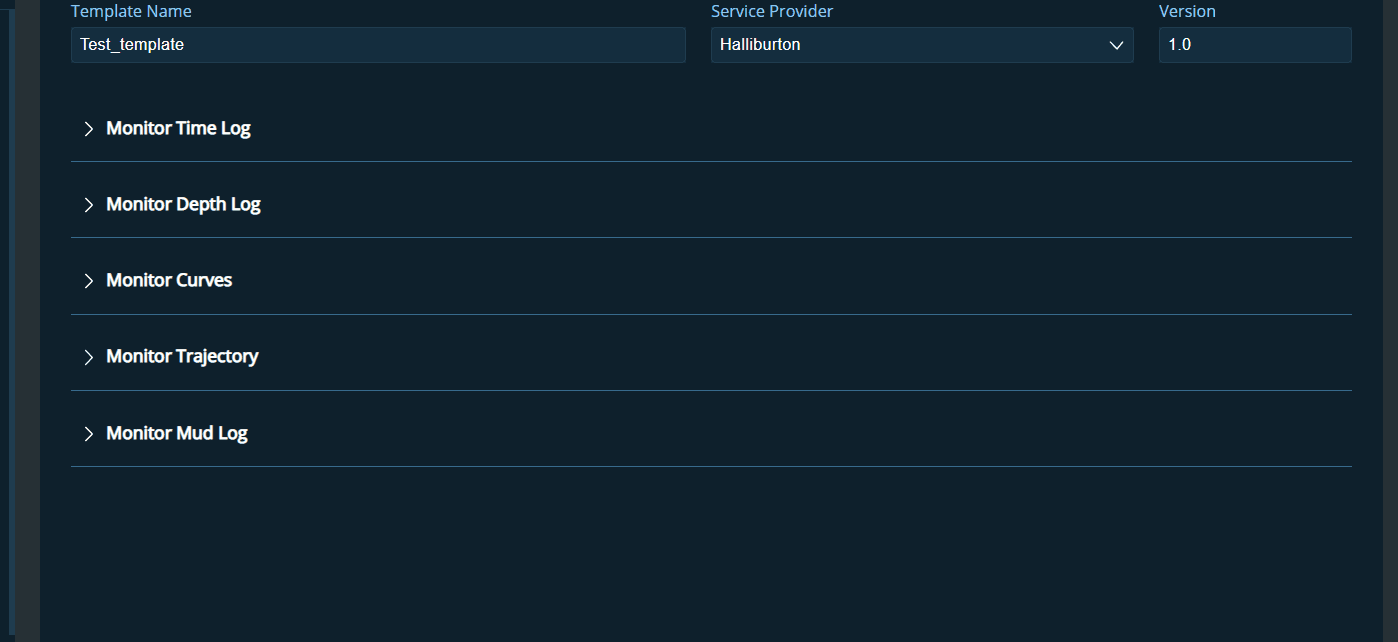 This page allows the user to choose a template from the template list, or the user can create a new monitoring template for each operator. Configuration for Logs, Trajectory, Mud log, and curves will be included in the template.