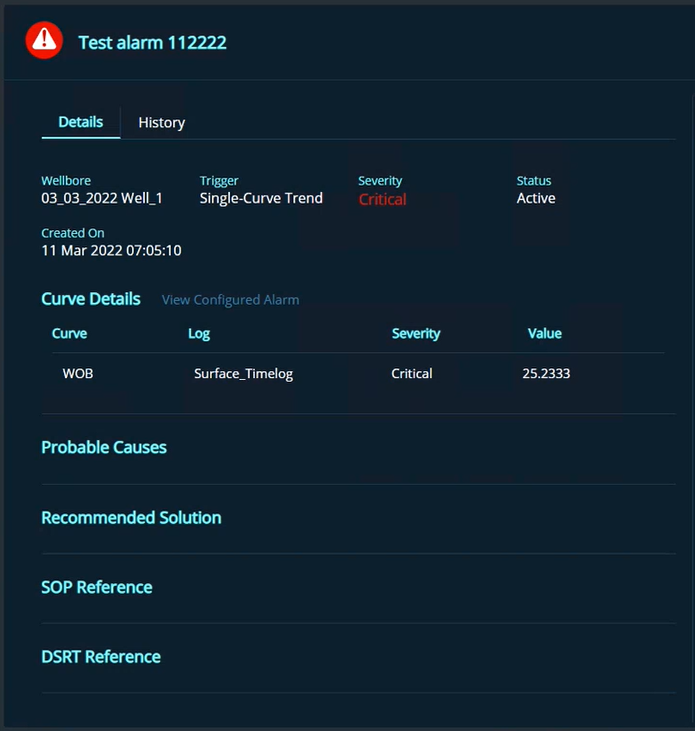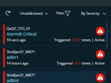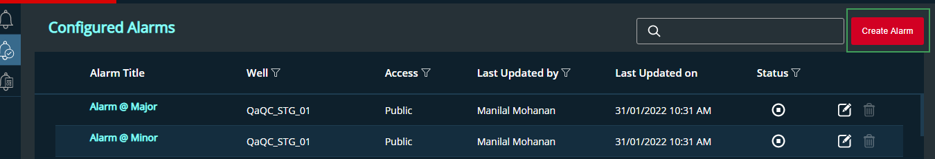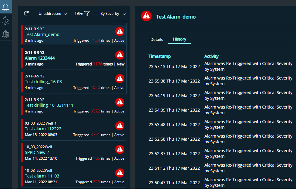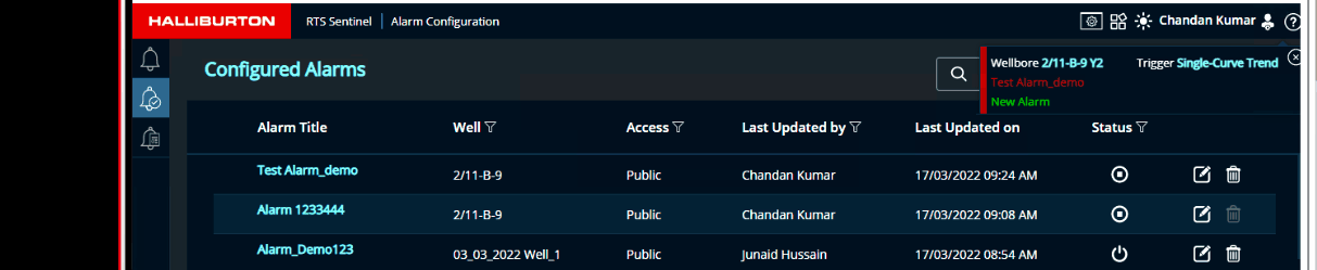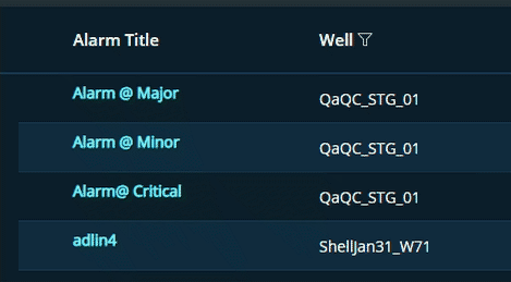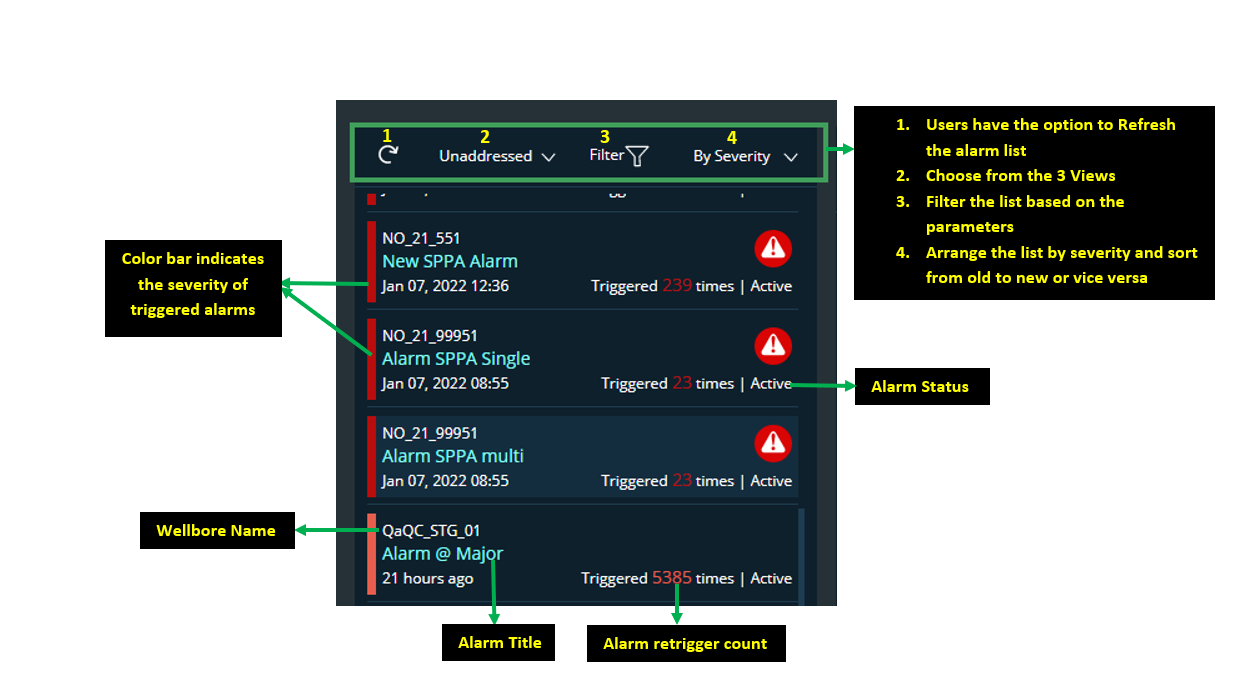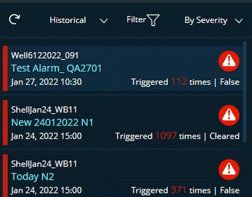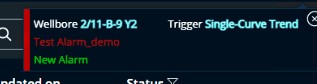 Alarms will be displayed with Wellbore name, Alarm title, Status and Trigger count.Based on the severity a color bar will be displayed