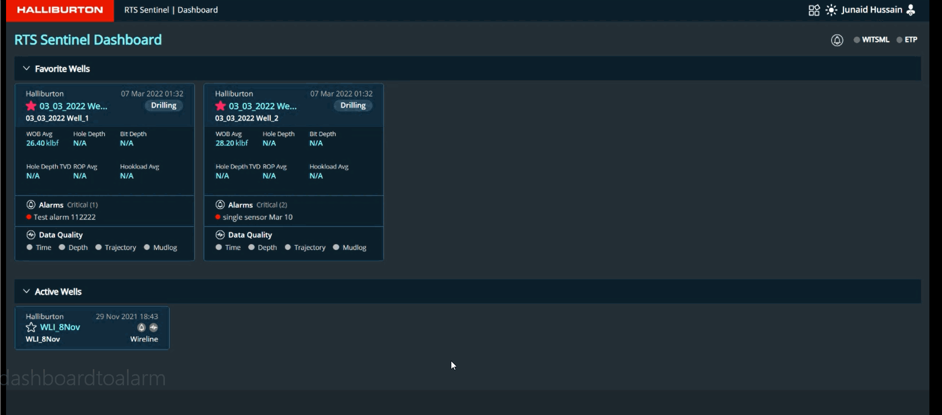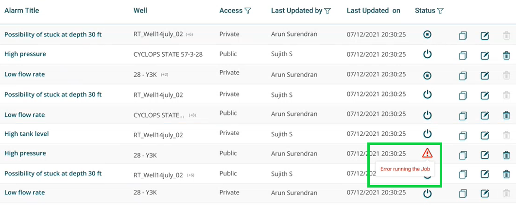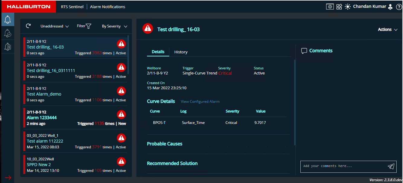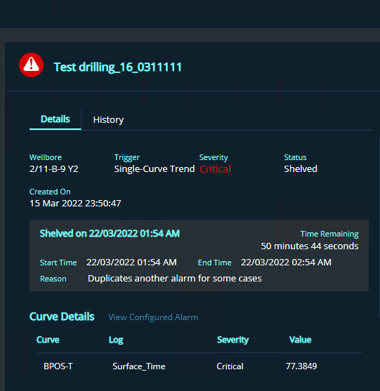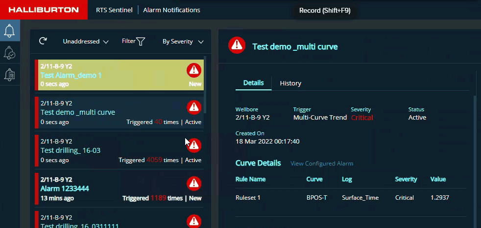 Alarms will be displayed with Wellbore name, Alarm title, Status and Trigger count.Based on the severity a color bar will be displayed