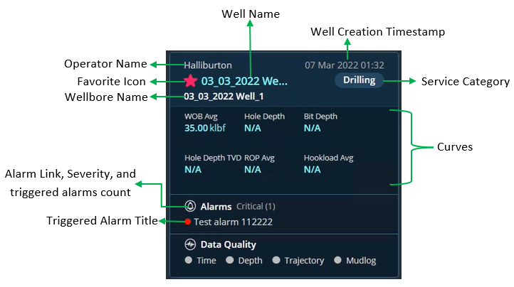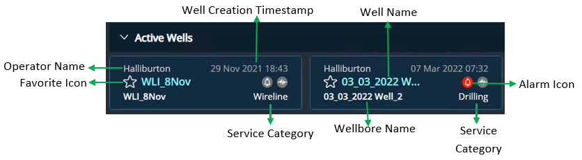 The active wells section displays a card for each of the active wells that the user is entitled to. This card will display the minimal details of the well.
