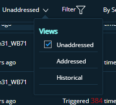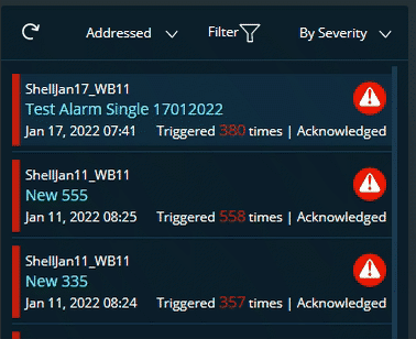 which displays the filtered list (Alarms triggered in the card) in the unaddressed view.