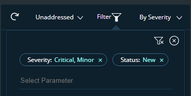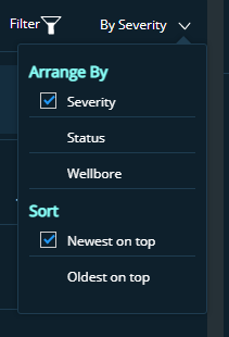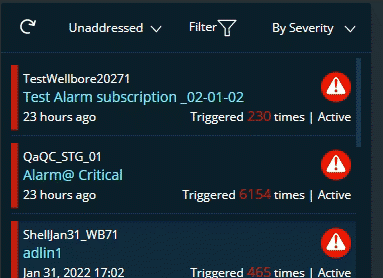 By default, the triggered alarms screen displays all unaddressed alarms. Alarms can be filtered using criteria based on one or more alarms parameters, such as severity, status, wellbore and so on.