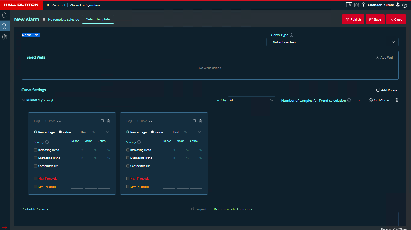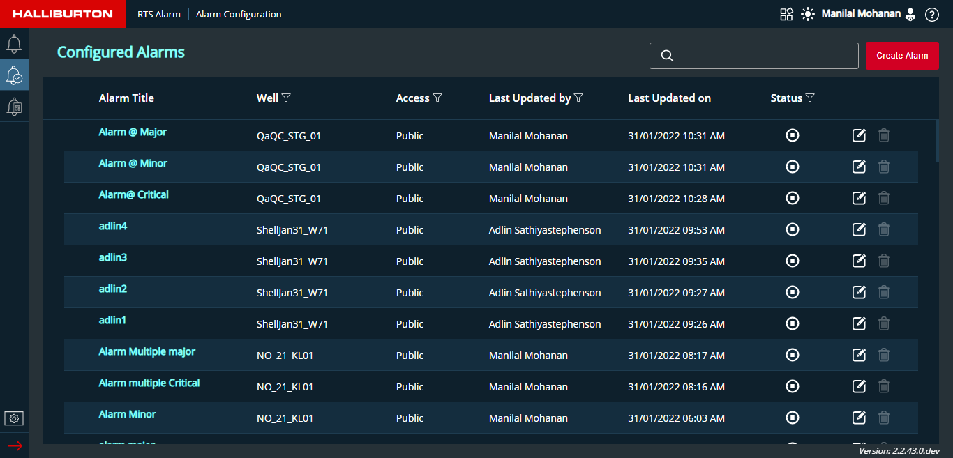 The configured alarm screen includes preconfigured alarms for the majority of common monitoring scenarios. Users can use alarm templates to customise predefined alarms or generate new alarms to fit particular monitoring scenarios. The configured alarms list can be viewed by users based on the wells to which they have access