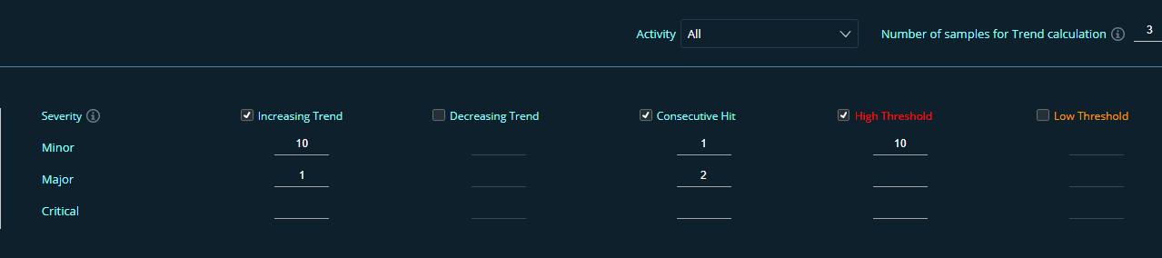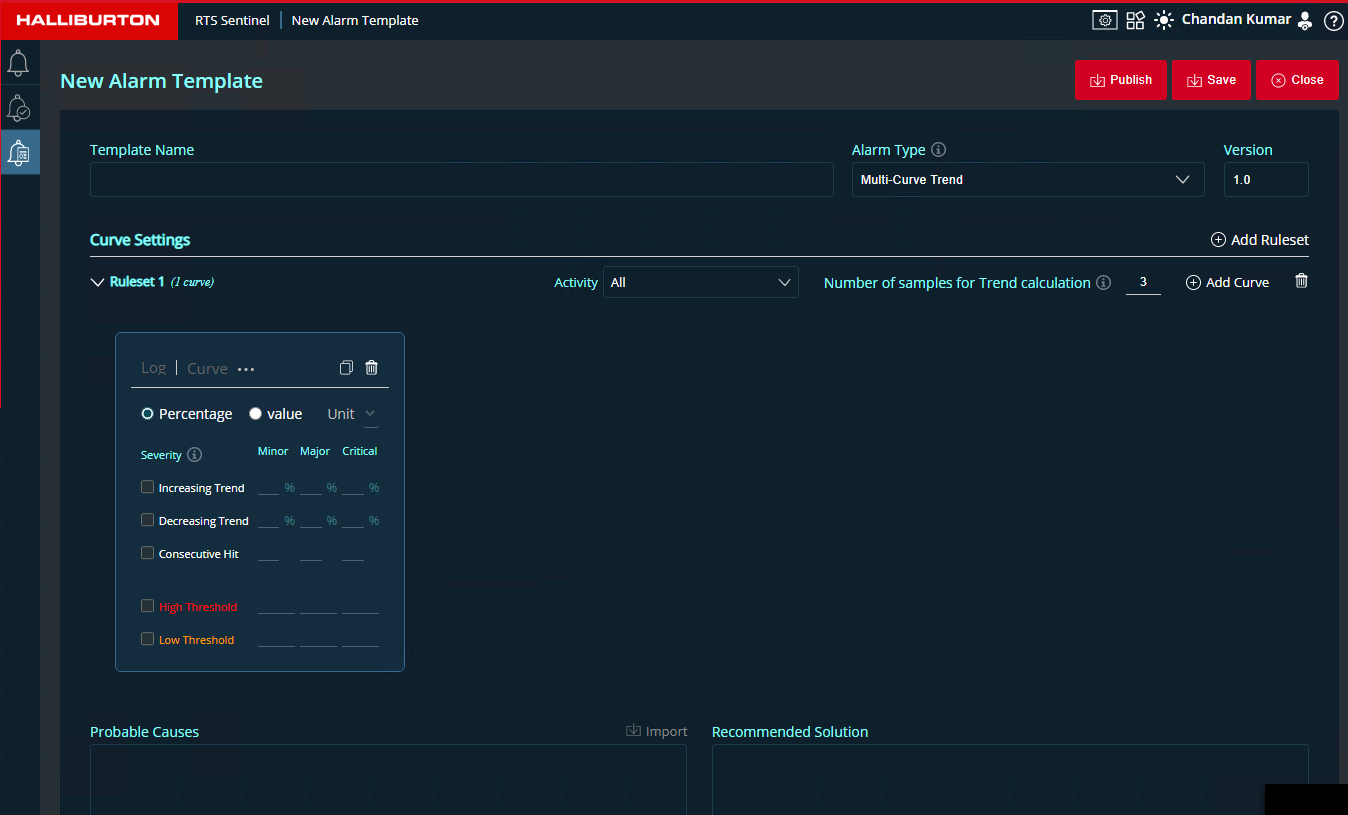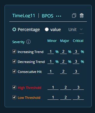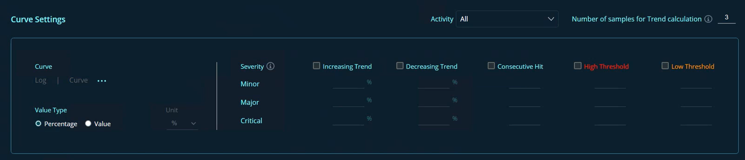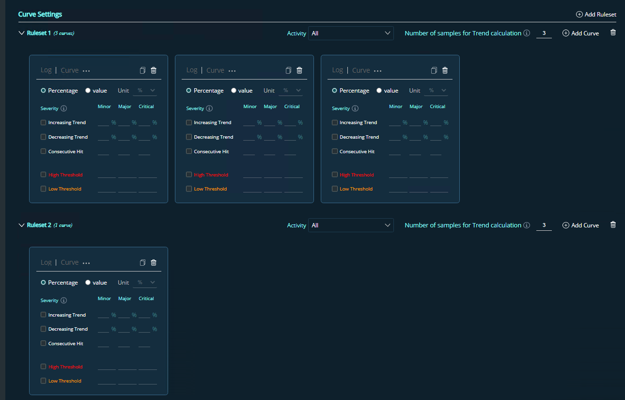 When multiple curve cards are added to the ruleset, the AND operation is performed to compare the curve cards' values. Across the rulesets, the OR operation is used. If a value is reached after being validated inside rulesetsĀ and across rulesets, an alarm is raised.