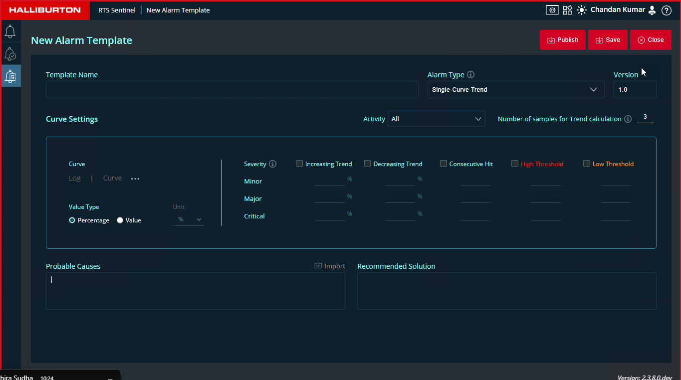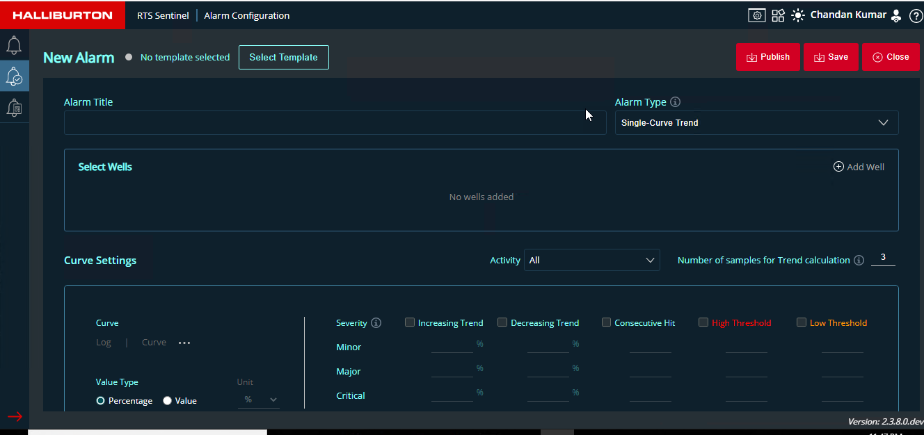 User can configure/create an alarm by setting suitable threshold. This screen will guide the user through the process of configuring alarms using alarm templates. They can also create an alarm and configure it to their preference. The user will be able to set up two alarm types.