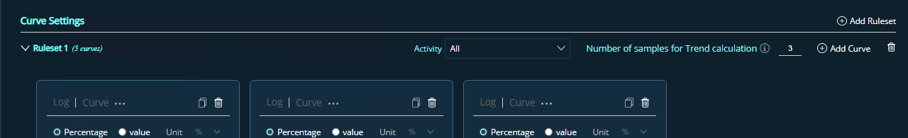 To create a multi-curve trend, follow the steps below. Users can configure multiple sensors here. By default, when multiple -curve trend is selected a ruleset with 1 curve card will be displayed in the curve settings section