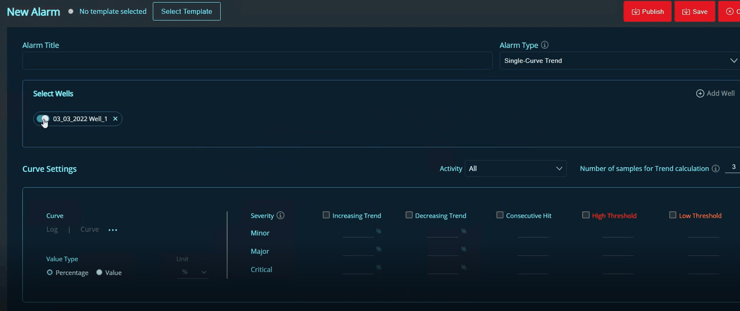 To create a single-curve trend alarm template, follow the steps below. Only One curve can be configured for this alarm type.